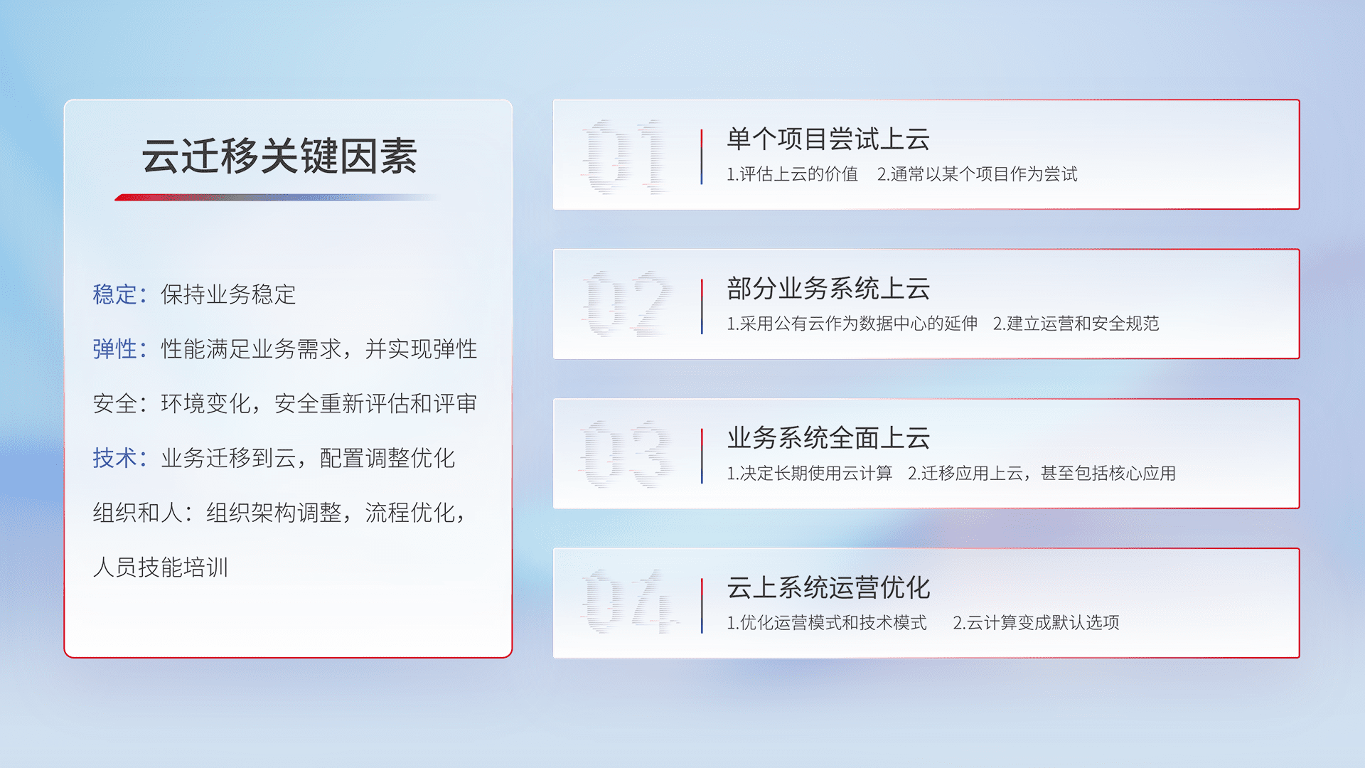 结合实际业务,,从规划设计、、、云平台选型、、、、云原生改造、、、、数据迁移、、集成交付,,,,迁移全过程为客户识别最佳上云路径,,,,做好风险识别管理,,,设计网络架构、、身份权限、、、、安全审计合规、、、、操作审计、、、、日志审计、、监控告警策略、、、多站点容灾设计等,,,,对云上基础设施进行整体规划,,,提升IT治理水平,,以满足弹性、、、、高可用、、高性能的需求。。。