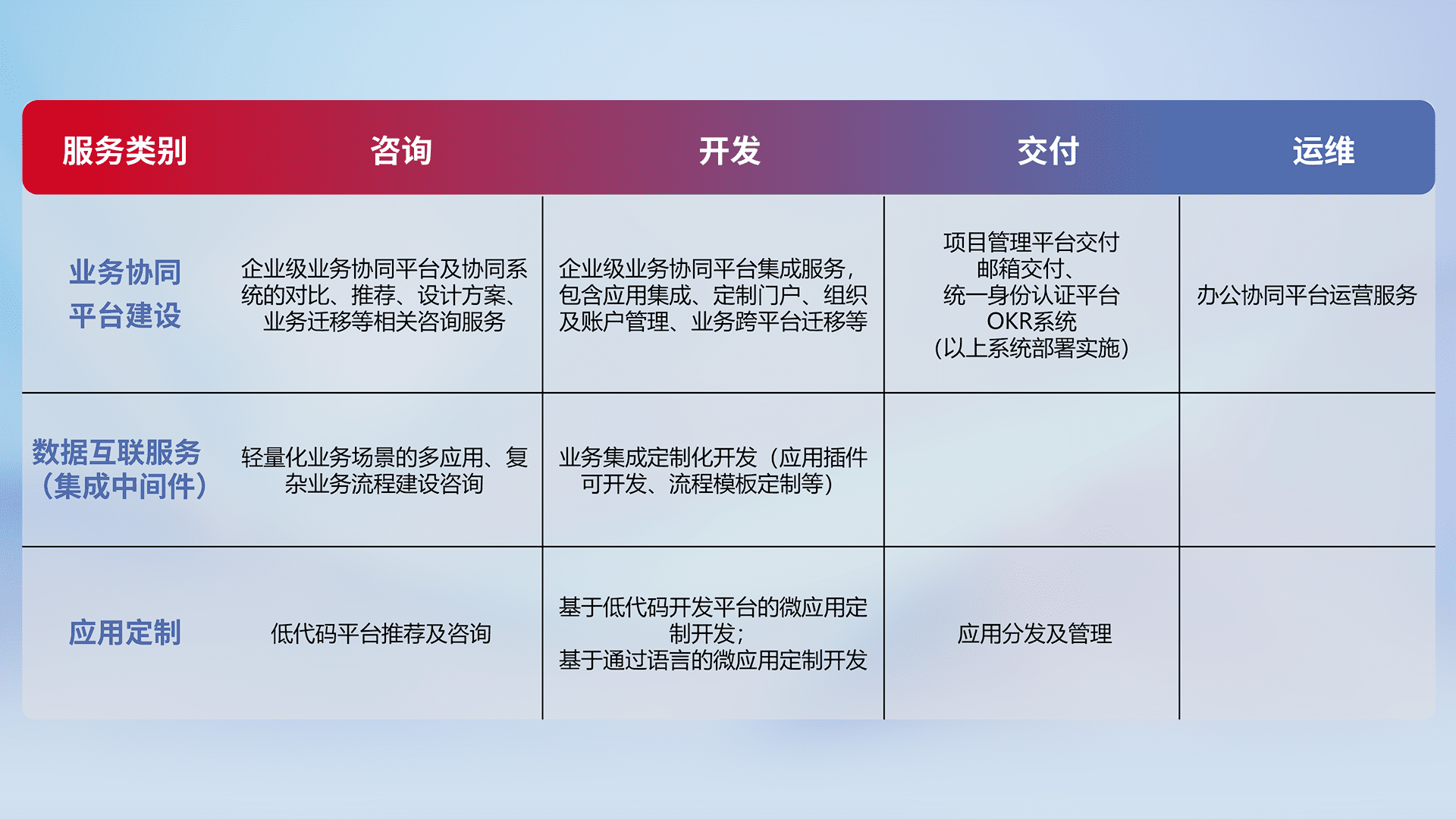 针对钉钉、、企微、、、IDaas等平台级产品提供产品的规划、、方案、、交付、、、定制化开发等服务,,实现如统一协同办公、、、、智能客户服务、、混合会议管理、、、、智能数据查询、、等业务场景,,实现数字化转型。。